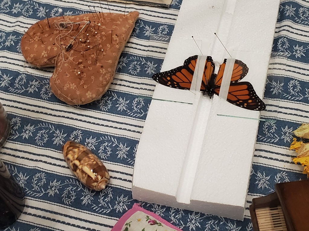 During the piece, a live butterfly pinning is displayed to the audience via projector. The projected space should be decorated with heirlooms, photos, and/or trinkets.
